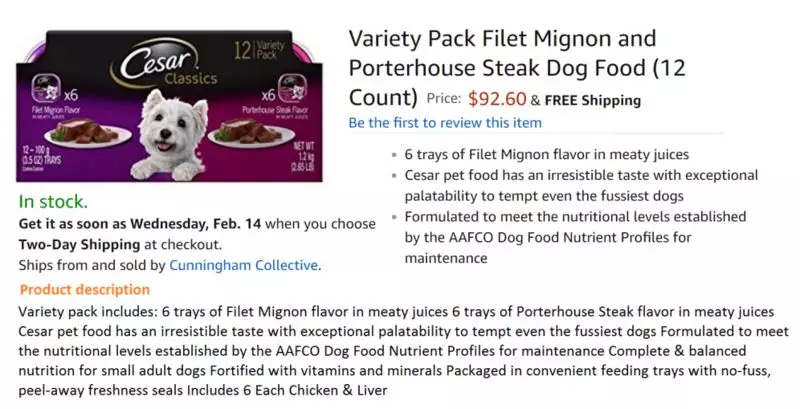 图 1 给出了一张亚马逊网站上一款狗粮的产品配置信息。产品标题“多包菲力牛柳和 T 骨牛排狗粮(12 小包)”中包含了两个属性:尺寸和味道,我们想提取这些属性对应的值,例如“12 包”(尺寸)、“菲力牛柳”(味道)和“T 骨牛排”(味道)。