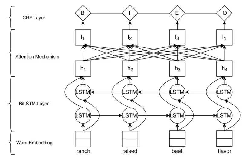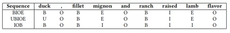 表 1 给出了上述标注方法的示例。给定一个序列,“鸭肉、菲力牛排和牧羊羔口味”(duck, fillet mignon and ranch raised lamb flavor),由 9 个单词组成(包括逗号),BIOE 标注方法提取出了 3 个味道属性的值,“鸭肉”、“菲力牛排”和“牧羊羔”,分别由“B”、“BE”和“BIE”表示。