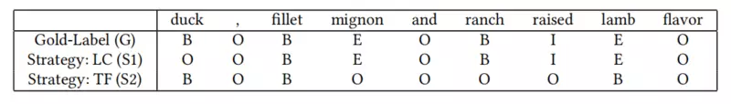 我们采用的基线方法是最小置信度法(Least Confidence, LC)。它选择出分类器给的置信度最低的样本。在我们的序列标注任务中,CRF 的置信度通过条件概率得到。然而这一方法有以下两个缺点:(1)整个序列的条件概率与产品的连续标注转换率成比例,因此任意词条标注的错误置信度都会降低整个序列的概率,从而无法实现有价值的搜索,(2)尽管这个方法能够反应词条标注的置信度,但是只能影响少数几个标注,对整个序列的影响较小。标注跳跃方法(Tag Flip)根据上述局限性,我们提出了一个新的搜索策略,将标注分给一个序列的不同词条的困难程度来判断这个序列的信息增益。