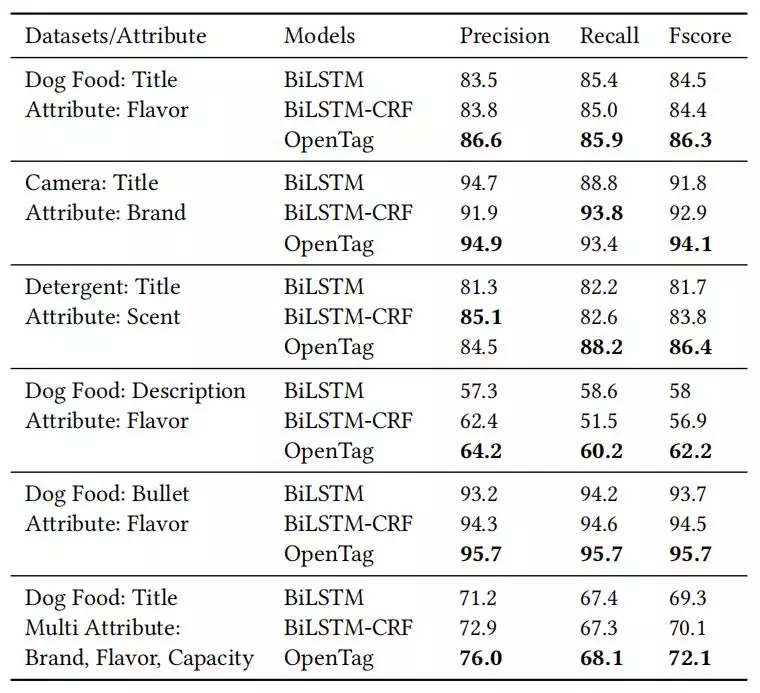 OpenTag 能够通过改变标注策略联合提取多属性值。在实验中,我们从狗粮产品标题中联合提取了品牌、味道和容量这三个属性值。从表 4 可以看出,OpenTag 相比于 BiLSTM-CRF 基线的 F 分数提高了 2%。