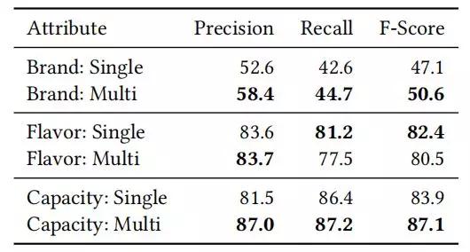 由于联合提取多属性值能够利用他们的分布式语义信息,因此比单独提取的效果要好,如表 6 所示。尽管品牌和容量这两个属性值的联合提取分数提高了,但是味道属性的提取分数略有下降。
