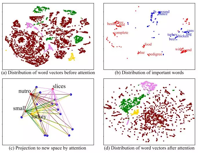 图 4(d)给出了经过注意力机制的操作后词向量的分布。与图 4(a)对比发现,使用注意力机制之后,类似的概念(标注)有了更好的聚类和区分度。