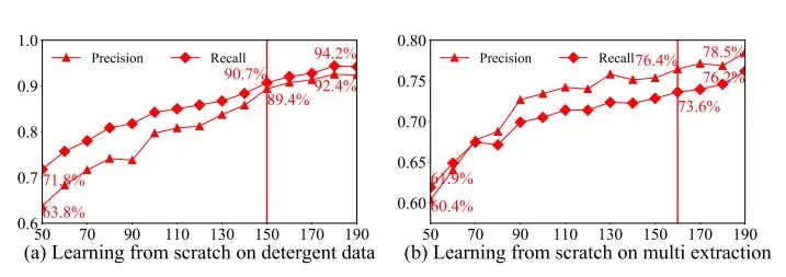 为了对主动学习框架进行严格的评估,我们使用一个保留测试集来验证主动学习的效果。我们以少量的标注实例(50 个随机采样的实例)作为初始标注集 L。图 5 给出了两个任务的结果:(1)从调味品的产品标题中提取气味属性值;(2)从狗粮产品标题中提取多属性值(品牌、容量和味道)。采用标注跳跃采样策略的 OpenTag 将单属性值提取的精度从 59.5% 提高到 91.7%,召回率从 70.7% 提高到 91.5%。我们也发现,标注跳跃方法比最小置信度方法对于单属性值提取的 F 分数提高了 5.6%,对于多属性值提取的 F 分数提高了 2.2%。