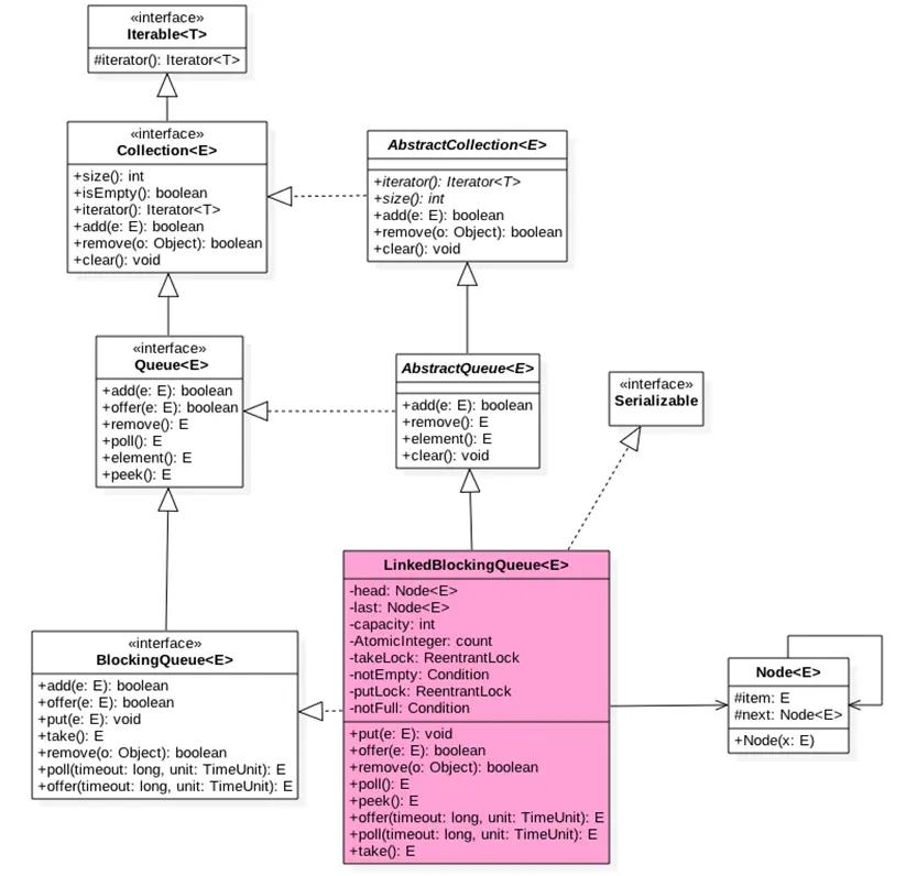 如类图所示:LinkedBlockingQueue是使用单向链表实现,有两个Node分别来存放首尾节点,并且里面有个初始值为0 的原子变量count,它用来记录队列元素个数。