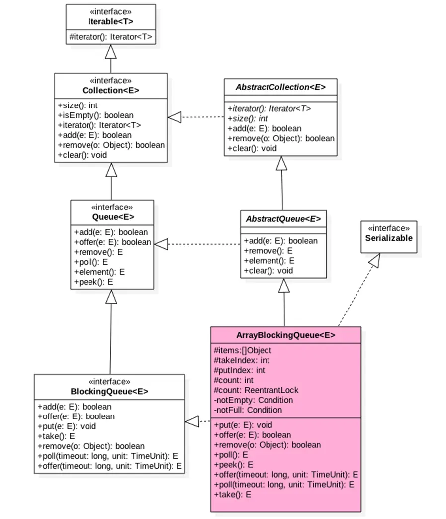 如类图所示,可以看到ArrayBlockingQueue 内部有个数组items 用来存放队列元素,putIndex变量标示入队元素的下标,takeIndex是出队的下标,count是用来统计队列元素个数,