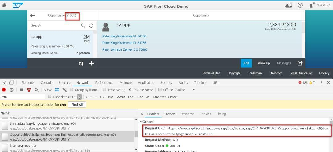 - $inlinecount=allpages: 返回数据库满足搜索条件的记录数。因为Jerry未指定搜索条件,所以返回系统里Opportunity的总个数1051。