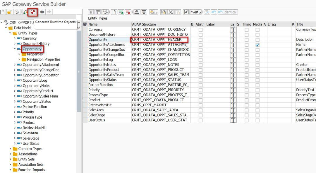 首先我们到ABAP Back-End服务器上,使用事务码SEGW打开CRM_OPPORTUNITY这个OData服务。可以看到Data Model里包含了很多节点,每个节点实际上由一个ABAP DDIC Structure实现,节点上的每个字段对应着Structure上的字段。我们定义好OData模型包含哪些Structure之后,点击工具栏的Generate Runtime Objects按钮: