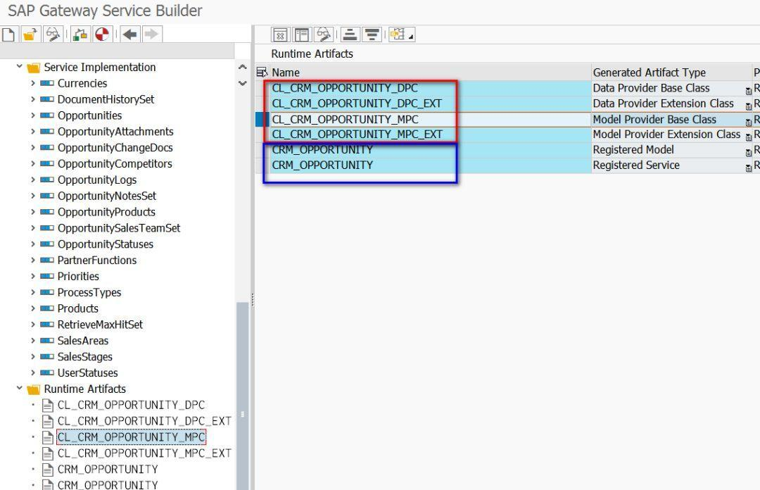 就可以自动生成OData模型,以及前一章节提到的MPC和DPC各两套一共4个ABAP Class,分别对应下图蓝色和红色区域所示,无需应用开发人员再写ABAP代码。