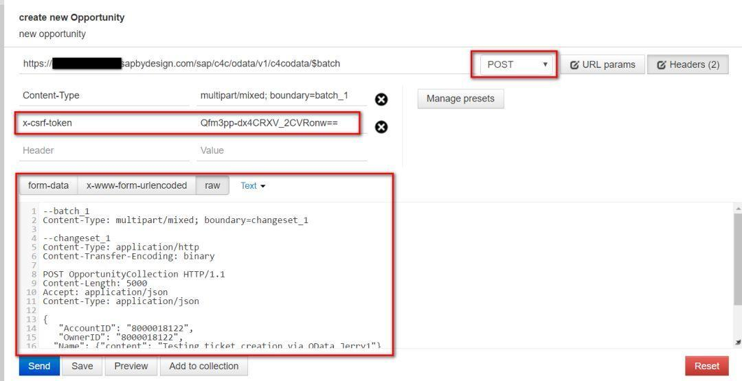 首先在postman里搞清楚如何使用HTTP Post加上OData的$batch操作来创建Opportunity:
