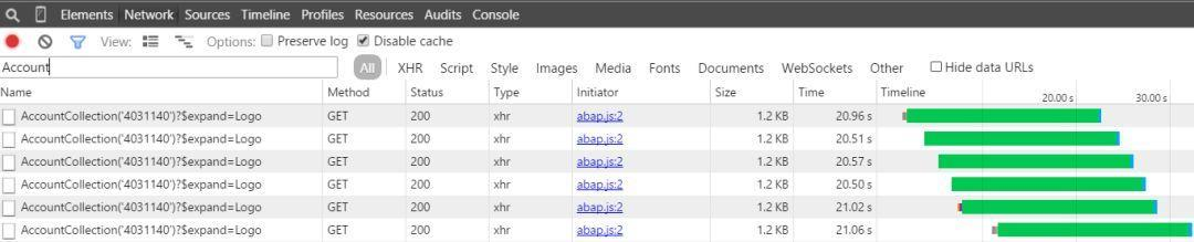 下图是5个请求以同步模式发出在Chrome开发者工具Network标签页中观察到的时序: