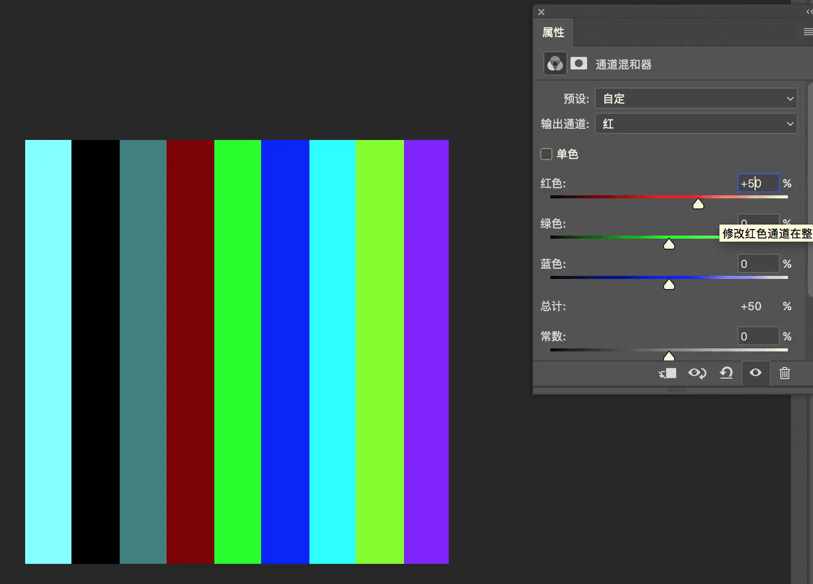 如下图所示,我们输出通道为红色中的红色减少到50%,可以看到上面红色部分的亮度变低了一倍,其他包含红色的部分色块的红色减少50%,色相会向红色的互补色青色进行偏移。