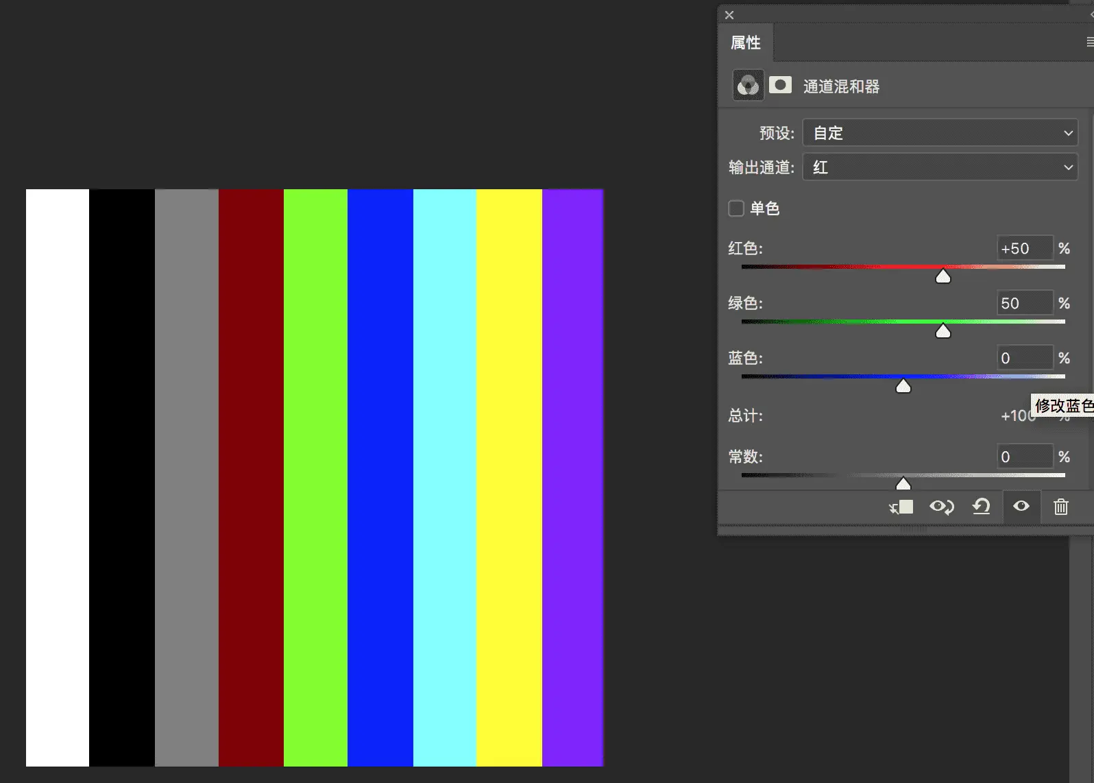 下面可以通过一个列子说明这个问题,输出通道为红色时,红色的亮度为100%,绿色和蓝色分别为0%。当我们把红色滑动到50%,绿色和蓝色保持不变时,一张图片中所有包含红色的像素的红色通道亮度都会减少50%,像素rgb整体的r的亮度会减少50%。