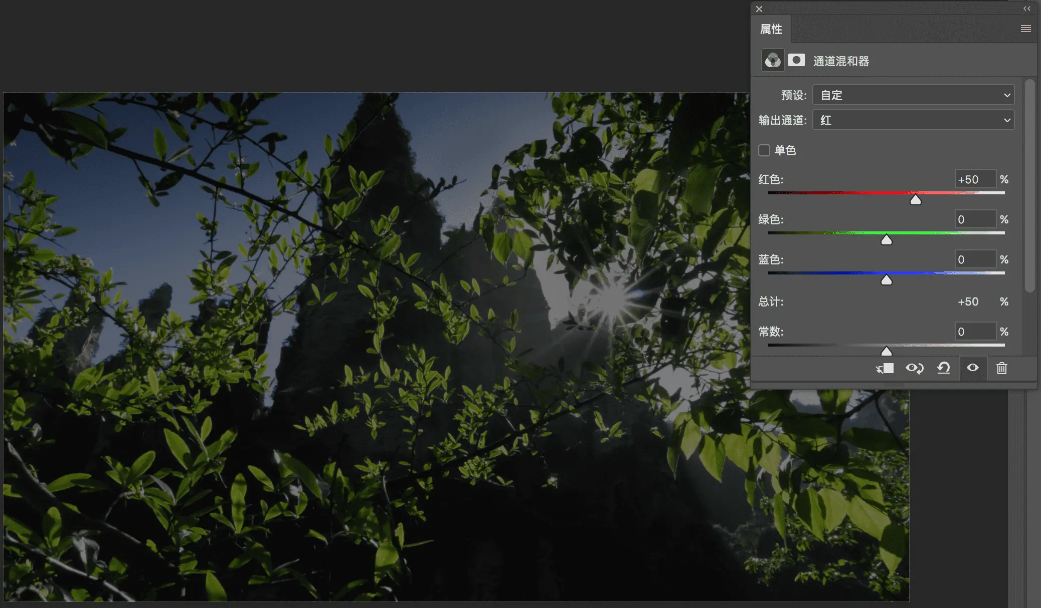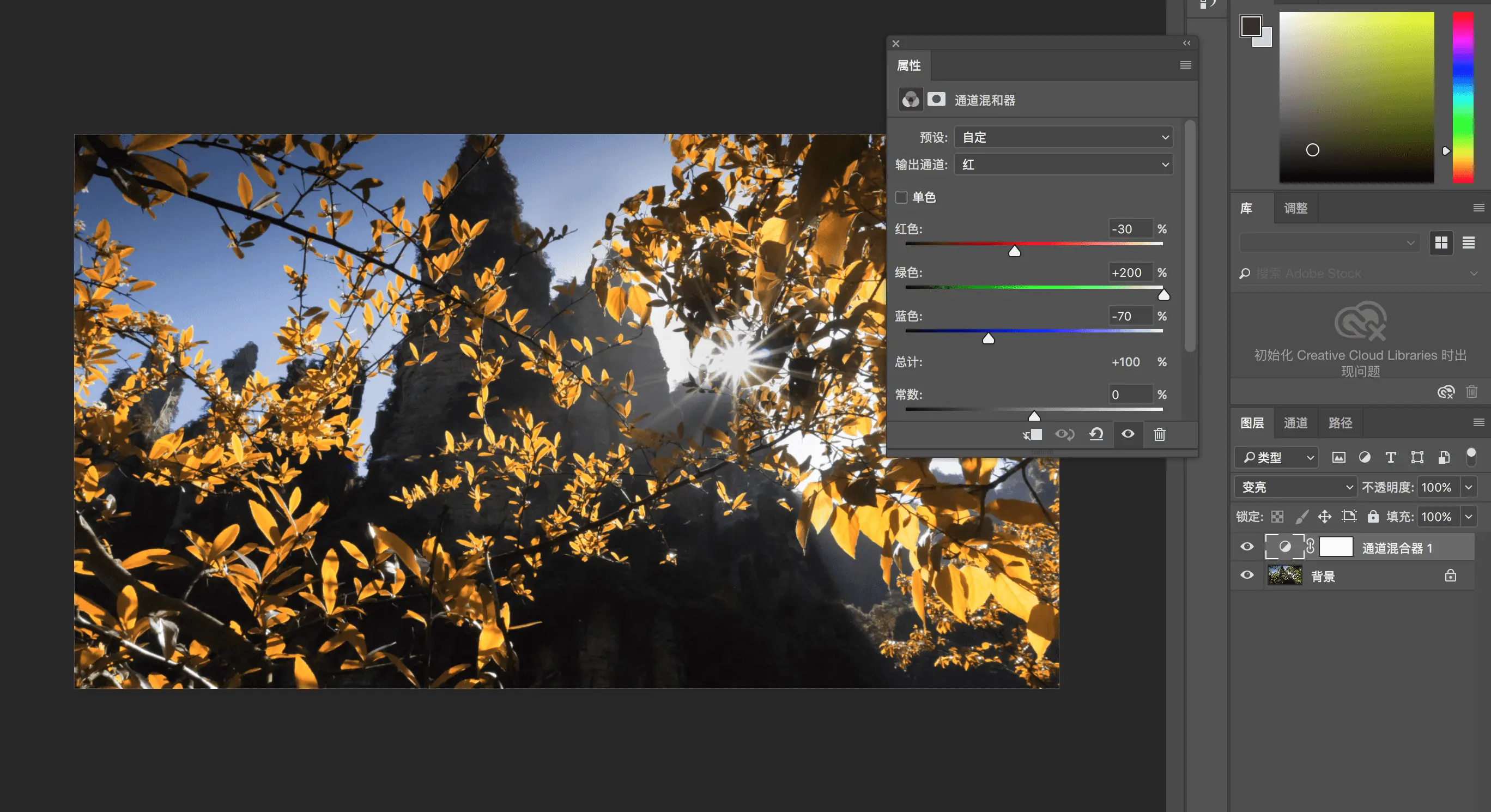 上图是团队夏天outing时在张家界拍摄的一张图片。简单分析下,图片基本是由绿色和蓝色组成。秋天和夏天色彩上的差别主要就是绿色的树叶会变为黄色。我们希望图片中的绿色可以变成黄色,其他色彩保持不变(PS中有其他工具可以直接将绿色色相转化成黄色),这个用上面介绍的知识,绿色中加入红色可以让绿色变为黄色,也就是说我们在红色输出通道中将绿色向右移动,红色和蓝色向做左移动保持总量为100%即可实现。这里将输出通道为红色中的红色由100%变为-30%,绿色由0%变为200%,蓝色由0%变为-70%,总量保持100% 不变。如下图: