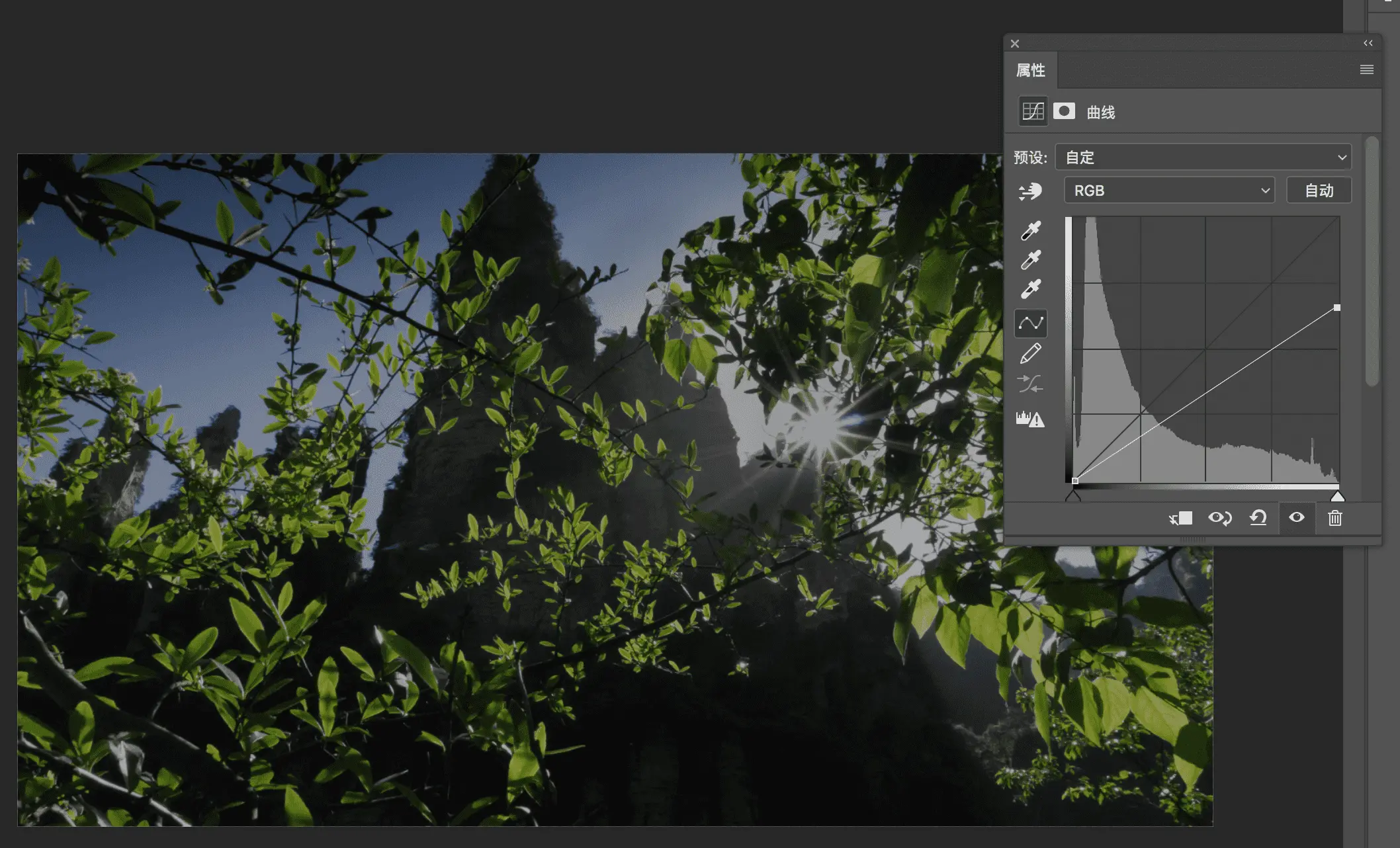 下面是曲线控制面板。曲线和通道混合器类似,对rgb通道亮度进行调节。曲线的横轴是原图的亮度分布,从左到右依次是0值纯黑,1-254的中间灰色值,以及最右边255的纯白最亮值。横轴上叠加着一个直方图,显示出原图各个亮度上,分别存在着多少像素。
