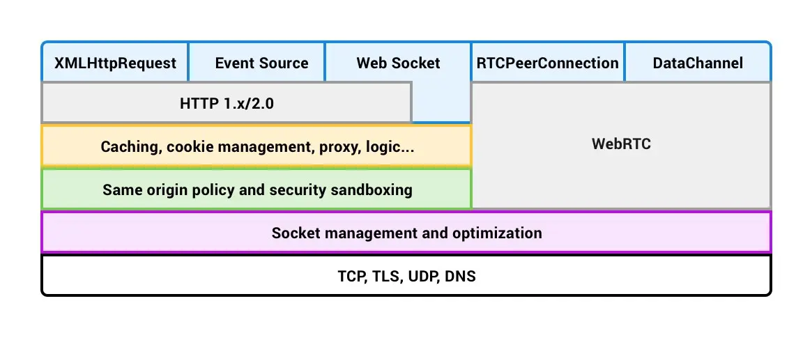 了解了网络服务之后,最终要讲到应用程序接口和协议。众所周知,更底层的结构提供了一组广泛的重要服务:套接字和连接管理,请求和响应处理,各种安全策略,缓存及其它更多的强制措施。每当初始化一个 HTTP 请求或者 XMLHttpRequest,一个持久的服务推事件或者 WebSocket 会话抑或打开一个 WebRTC 连接,我们就是在和部分或者所有这些底层服务进行交互。