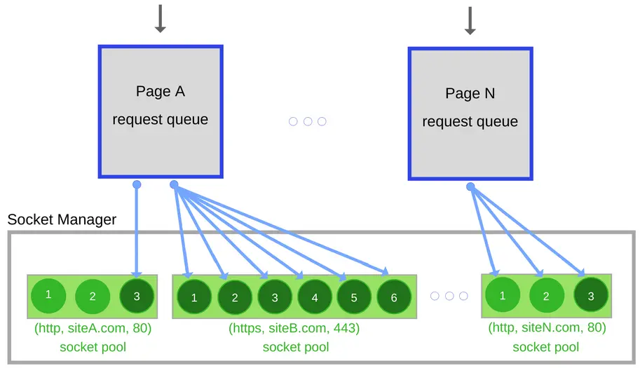 实际上,现代浏览器更一步地将请求管理周期从套接字管理中剥离了出来。用套接字池来组织套接字,以源来分组套接字,每个套接字池强制限制其连接数和安全约束。排队,优先化等待的请求,然后和套接字池中的单个套接字绑定。如果不是服务器主动关闭这些连接,多个请求可以自动重用相同的套接字。