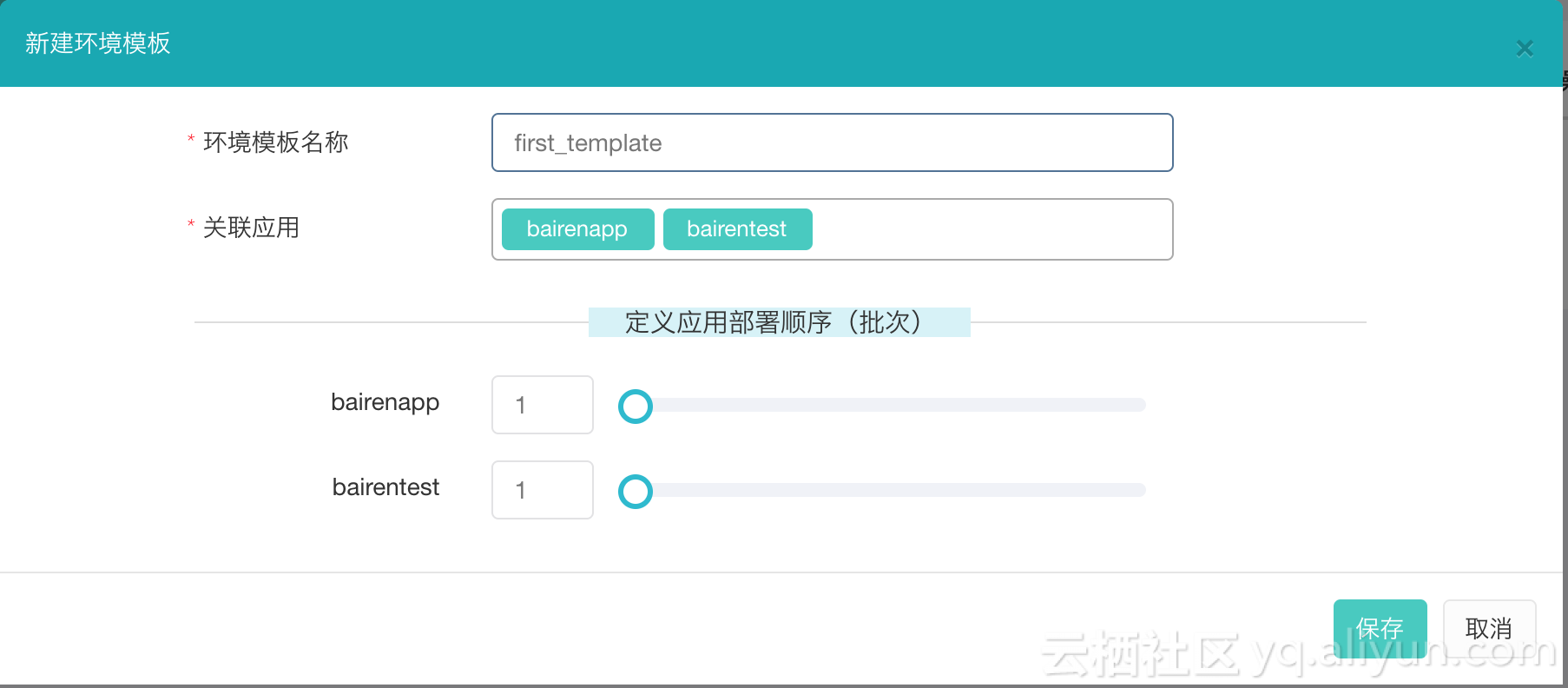 点击新建模板后,输入模板名称,以及管理的应用和应用部署顺序,点击保存。