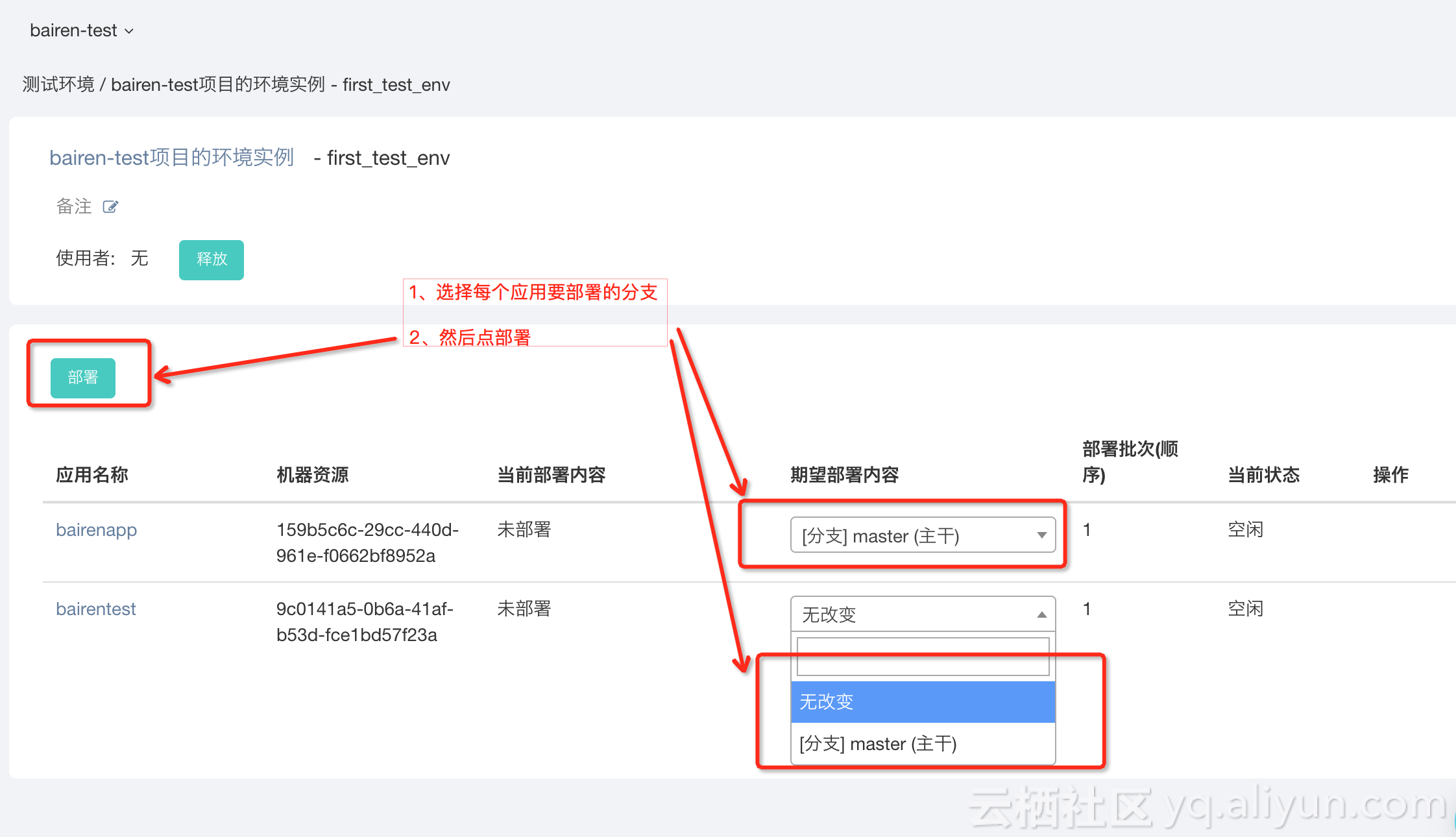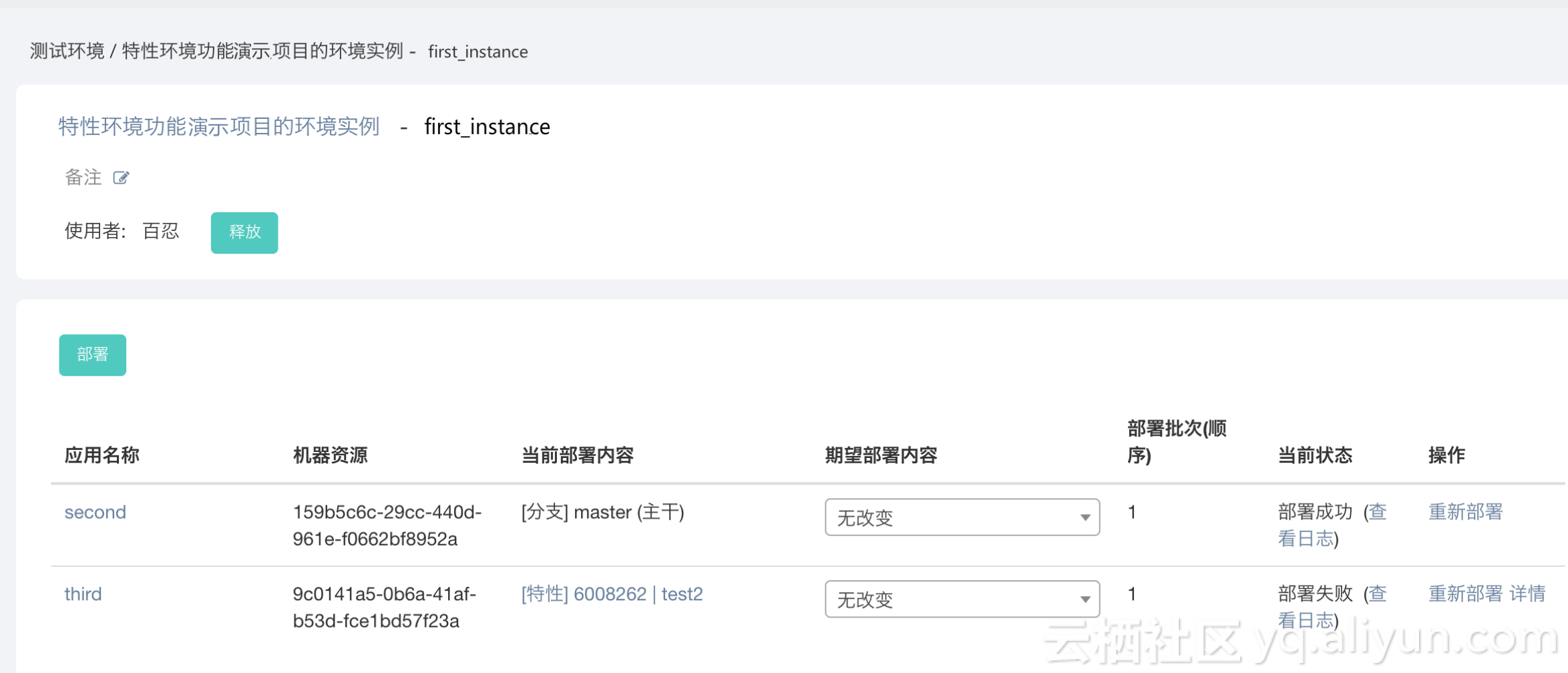 在实例详情里选择要部署的特性分支,然后点击部署。注:“无改变”就是不部署当前应用,“主干”不属于特性分支,必须选择一个特性分支(一个环境实例的一次部署中,至少要有一个应用选择特性分支,否则不能发起部署)。如果没有请到特性分支菜单里创建一个。