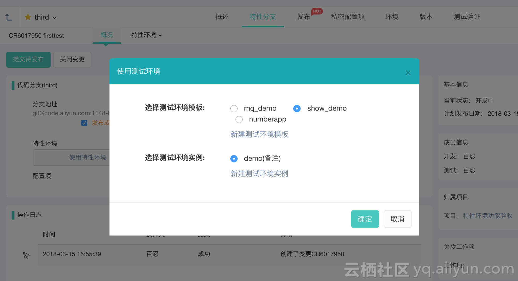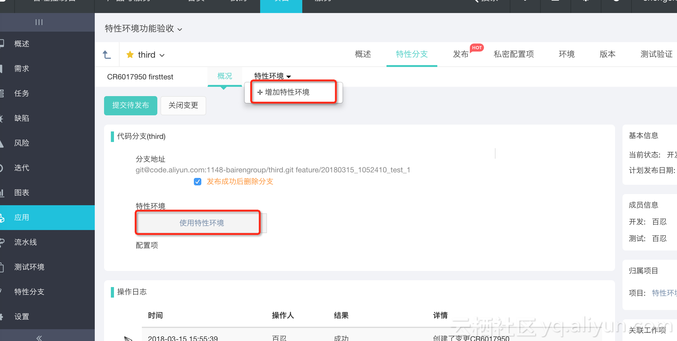 在特性分支详情中,选择使用特性环境或者增加特性环境。