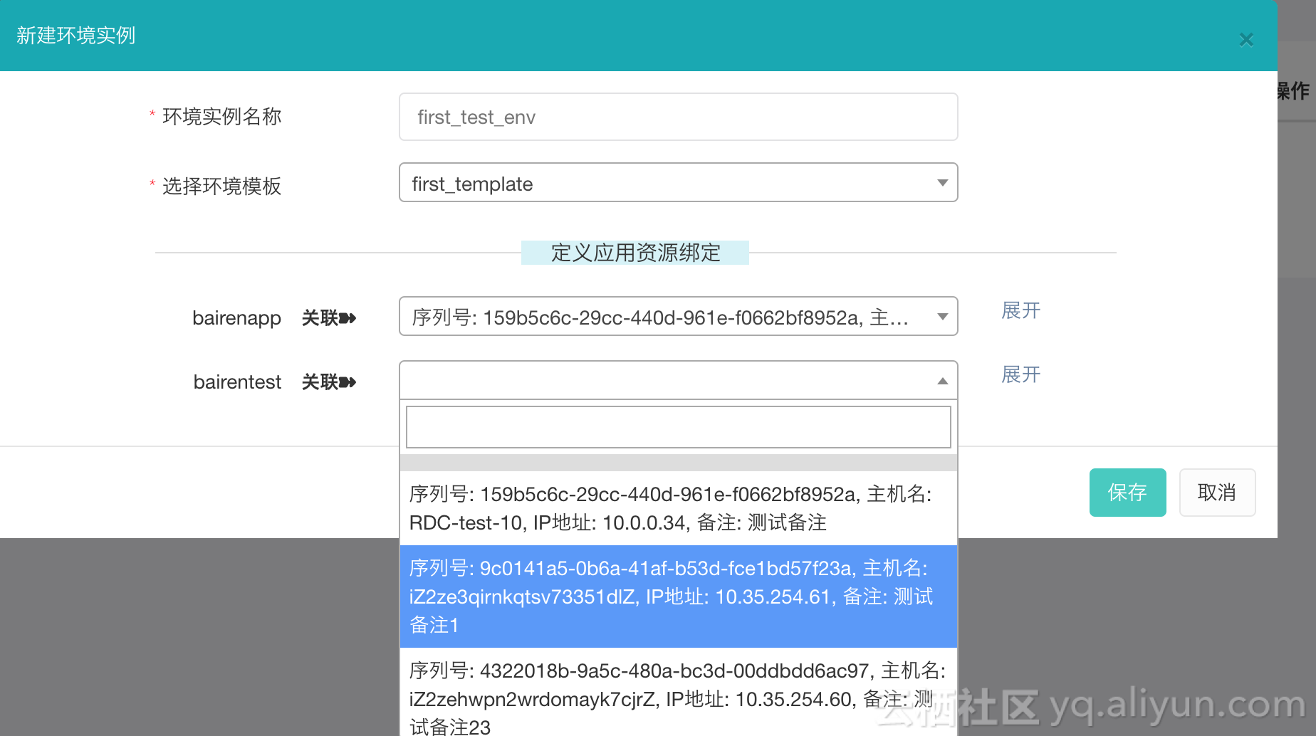填写环境实例名称,选择模板,配置关联机器。