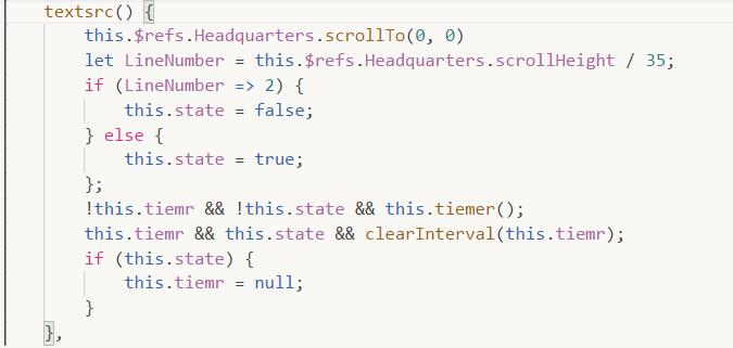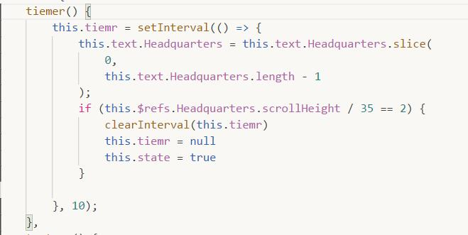 tiemer() { this.tiemr = setInterval(() => { this.text.Headquarters = this.text.Headquarters.slice( 0, this.text.Headquarters.length - 1 ); if (this.$refs.Headquarters.scrollHeight / 35 == 2) { clearInterval(this.tiemr) this.tiemr = null this.state = true }