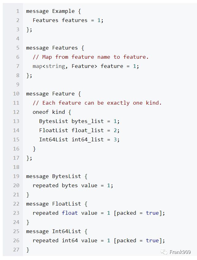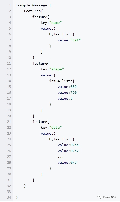 TFRecord 的核心内容在于内部有一系列的 Example ,Example 是 protocolbuf 协议下的消息体。