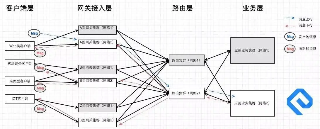 管理大量客户端连接,单个节点可以维护的客户端数量在数十万量级;处理不同类型客户端的协议兼容,由于客户端实现技术的多样性,导致客户端与网关之间底层的数据通信协议存在差异,需要由不同的接入网关做协议转换;处理数据安全逻辑;跨网络的高可用逻辑,网络级别的主备(谁知道哪天网线会被蓝翔的毕业生挖断呢?);广播消息的高效下行分发,将收到的广播消息分发到所有连接在本节点上的客户端。