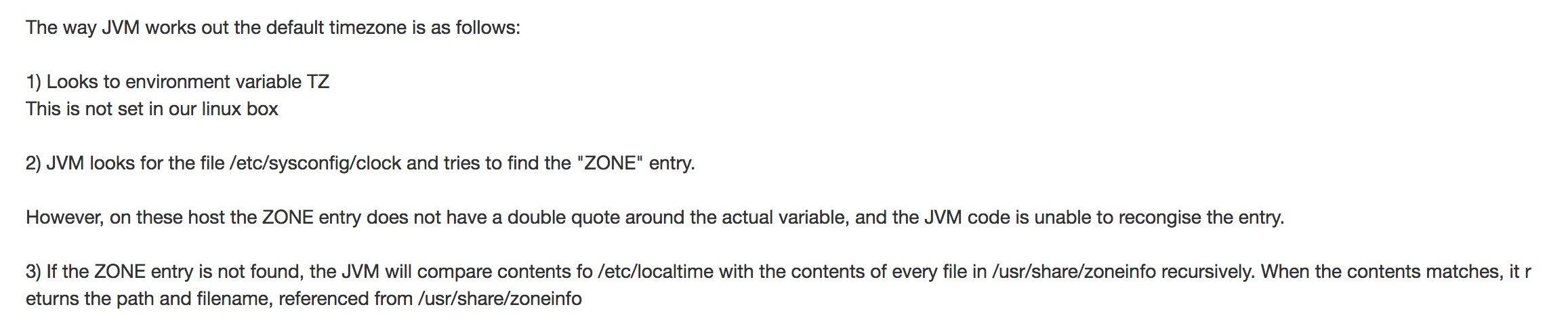 从上面测试结果可知,在我这种环境下,JVM读取时区文件顺序依次为:$TZ > /etc/timezone > /etc/localtime > 默认GMT , 所以跟搜索到的情况不一样,跟文件/etc/sysconfig/clock 无关。
