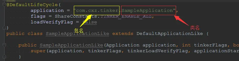 新建一个类,名字叫 SampleApplicationLike (随意起),并继承 DefaultApplicationLike ,注意这里不是继承 Application ,这个是 Tinker 的推荐写法。其他的注解和重写的方法,照着写就好了。最后自己的 Application 逻辑就写在 onCreate() 方法里面。