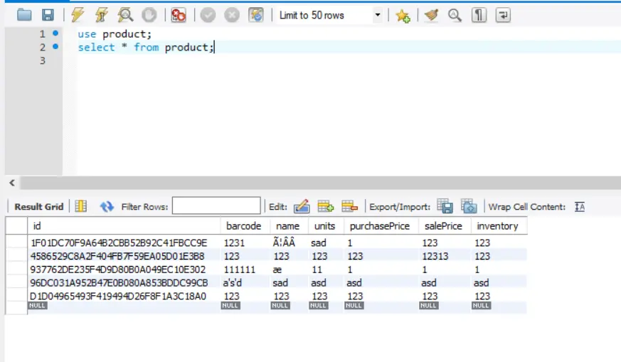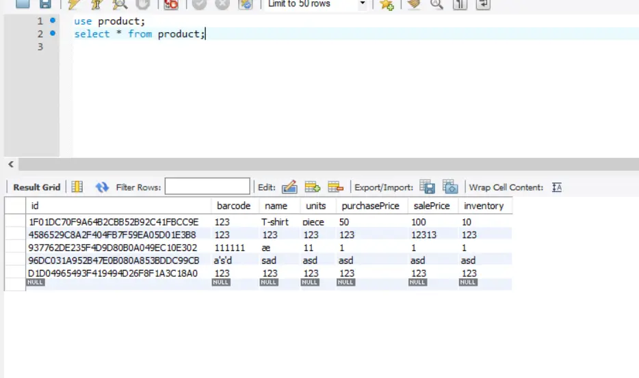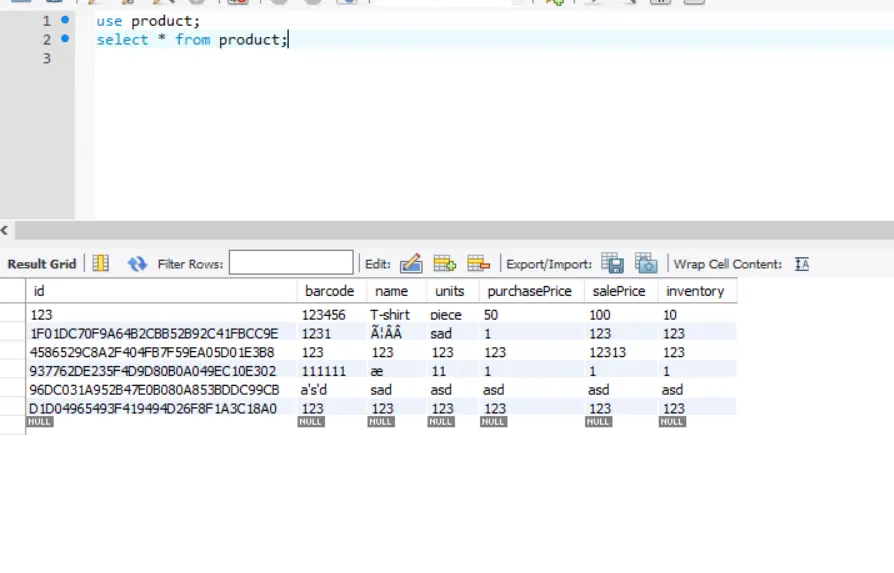使用到的数据库中的表为 product 表: