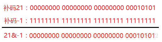 21&-1 = 21; 正数补码和原码相同所以不必再转换。负数需除最高位取反后+1得原码。