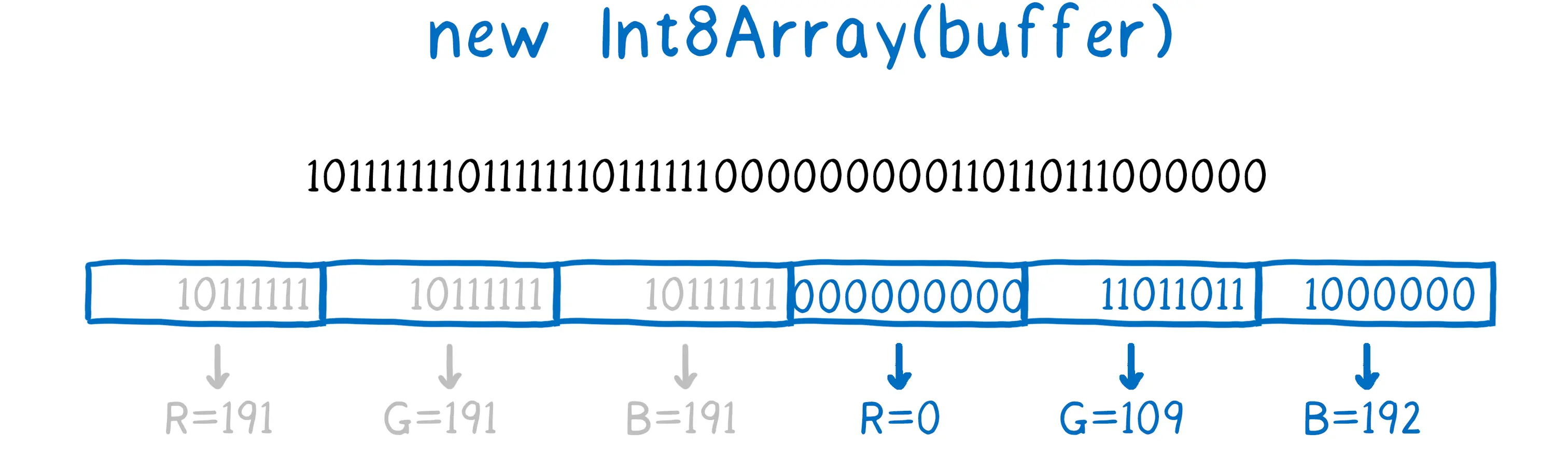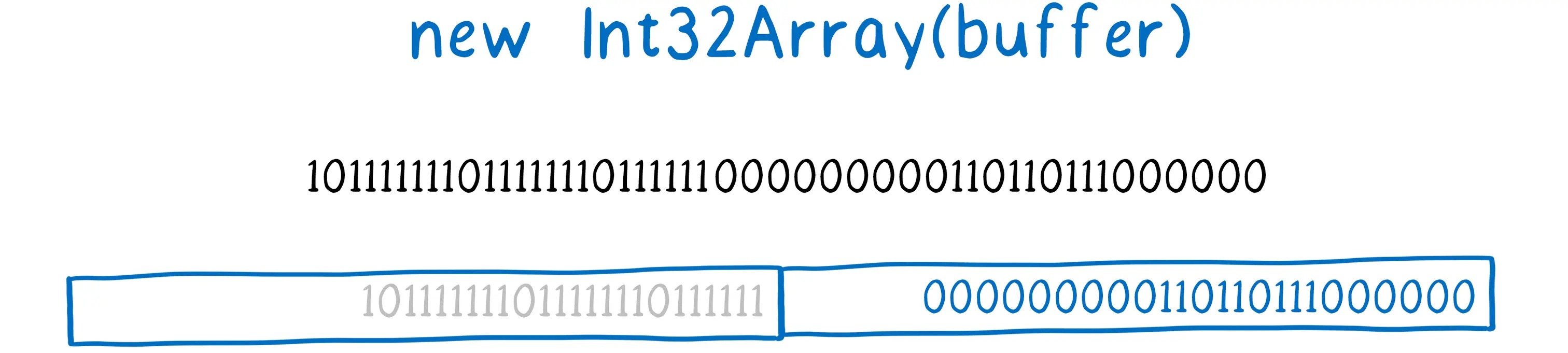 线性内存其实是一大行0和1。如果你想赋予这些0和1意义,那你需要指出如何分割它们。你要做的是为AarryBuffer创建一个TypedArray,告诉JavaScript如何对AarryBuffer里的比特位(bit)行分段。就像正在绘制的格子围绕着这些比特位对它们说那些比特位是属于那些数字。