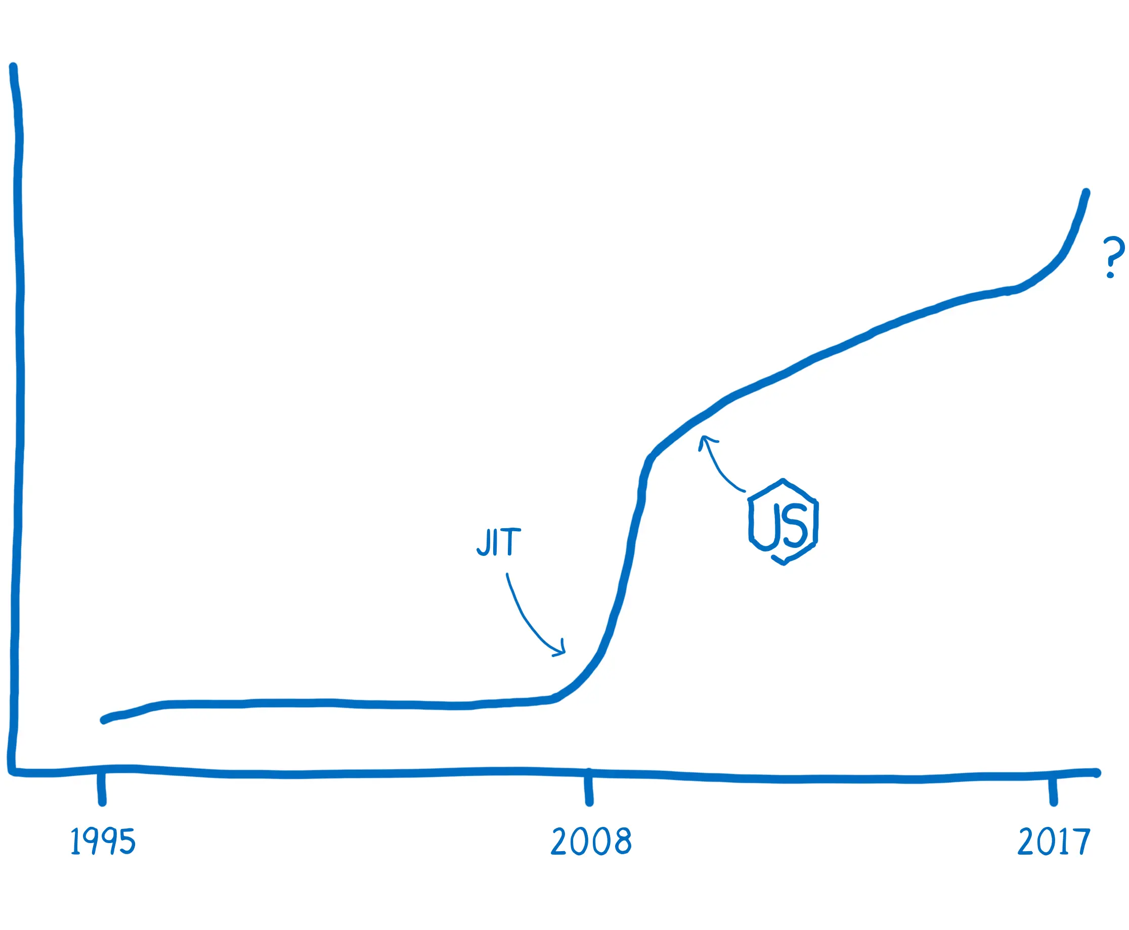 在今年的欧洲JSConf上来自Mozilla的Lin Clark为我们展示一个神秘项目,一个的拱形彩虹门(视频传送门),它实际上是由三万个彩色LED组成的画布,可以展现灯光动画,并且通过Rust编写的WebAssembly模块来控制“拱门”的灯光动画。Lin在2017年的JSConf上也曾做过关于WebAssembly的演讲,在该演讲中她提到2008年是JavaScript执行效率曲线的一个拐点,随着众多浏览器加入了JIT编译器(Just-in-time compiler),JavaScript的运行性能带来了十倍的增速,这为JavaScript插上了一双翅膀使它可以自由翱翔在浏览器端、服务器端和客户端。Lin指出WebAssembly的诞生可能会成为曲线的下一个拐点。可见Mozilla对WebAssembly的重视程度。