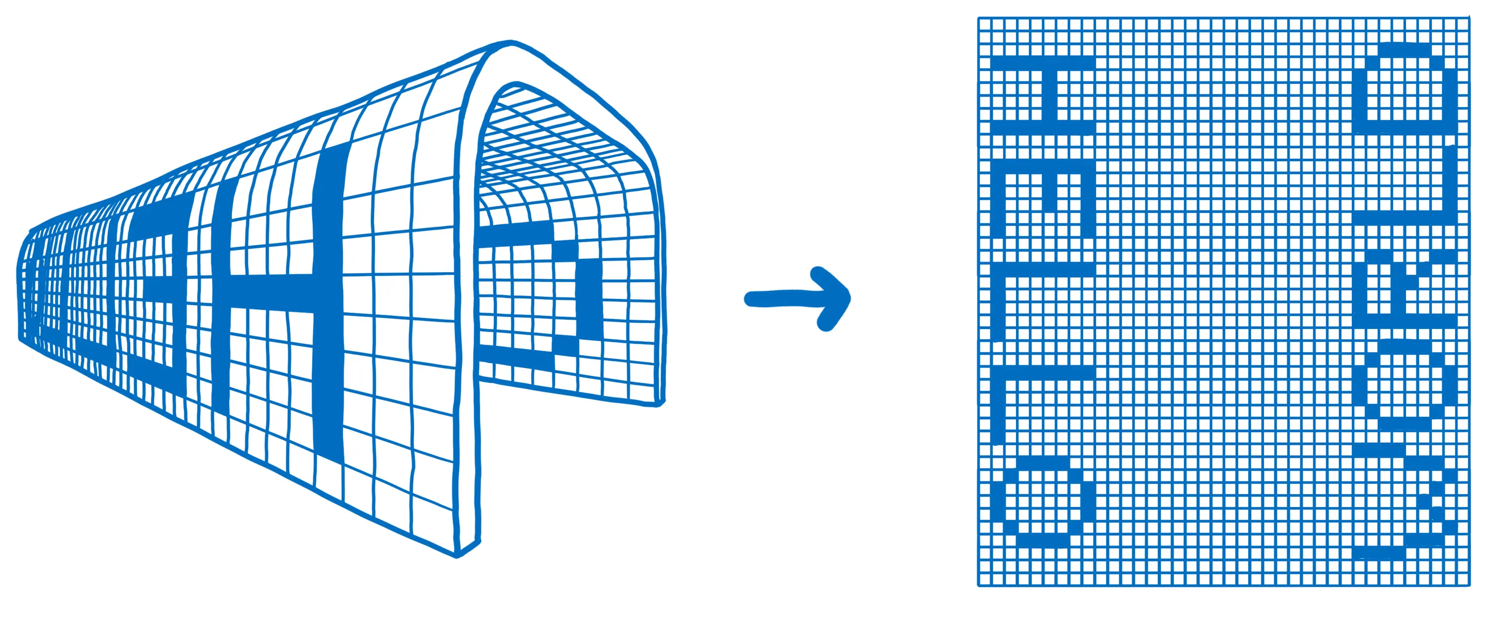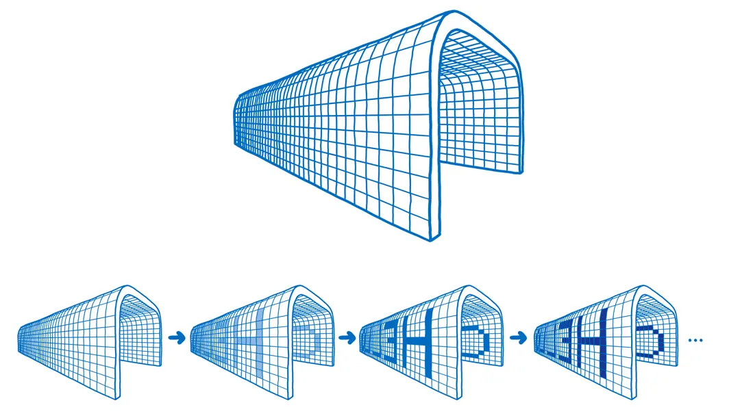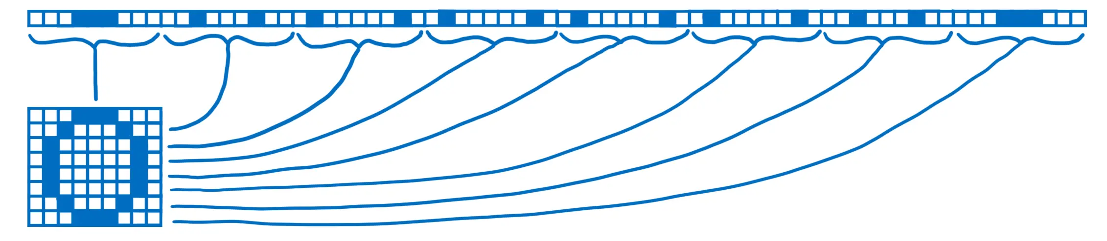 现在下降到了一行像素,我们已经可以把它放到内存里面了,因为WebAssembly内存(linear memory)基本就是一排小格子。这意味着我们已经下降到一维结构,但是仍然拥有着代表着二维、三维或四维的全部数据。只是现在它们是以一种连续的、线性的方式在展示。
