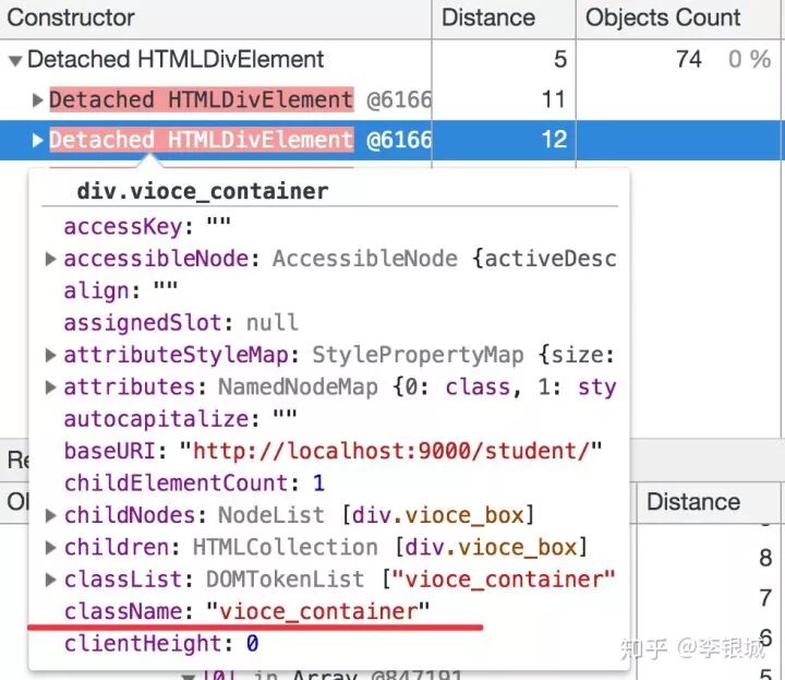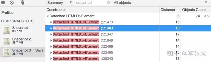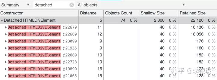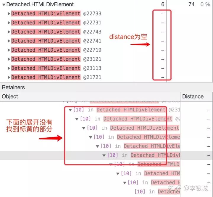 把这个地方改一下,重复操作一遍,再拍一张内存快照。我们发现游离的div节点仍然是74个且disance不为空,没有改进如下图所示: