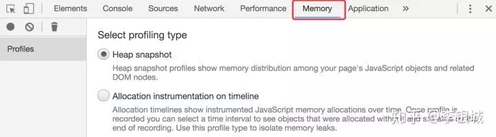 然后打开devtools,切到Memory的tab,选中Heap snapshot,如下所示: