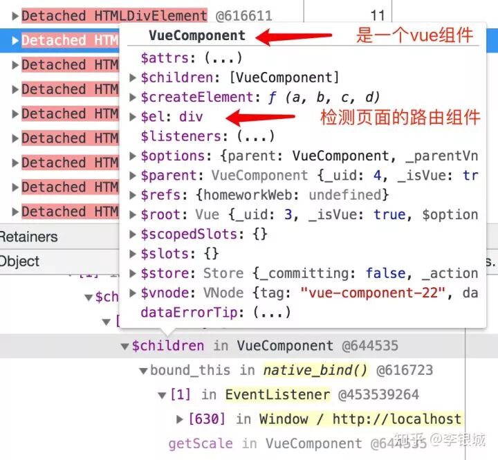 所以虽然Vue组件把DOM删除了,但是还有个引用存在,导致组件实例没有被释放,组件里面又有一个$el指向DOM,所以DOM也没有被释放。