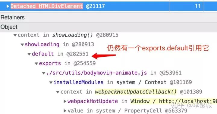 仍然有一个exports.default指向它,它是webpack的模块,我猜想是因为本文开篇提到的例子的原因,就是模块形成了闭包,它的变量没有被释放造成内存泄露,所以在stopLoading里面把它置成null: