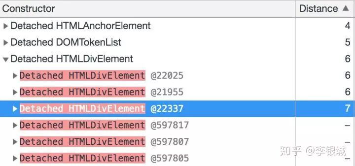 它就会显示所有已经分离了DOM树的DOM结点,重点关注distance值不为空的,这个distance表示距离DOM根结点的距离。上图展示的这些div具体是啥呢?我们把鼠标放上去不动等个2s,它就会显示这个div的DOM信息: