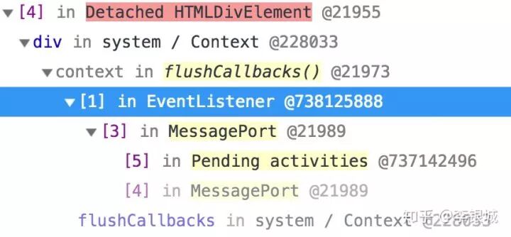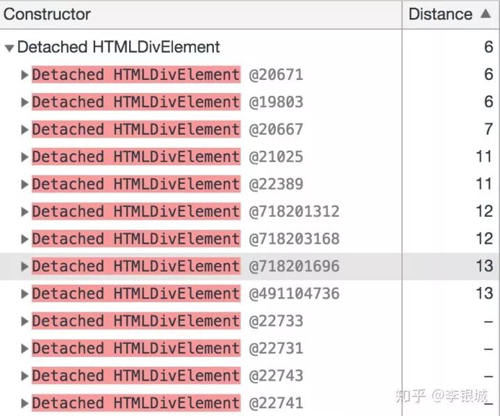 并且可以借助Chrome的内存分析工具进行快速排查,本文主要是用到了内存堆快照的基本功能,读者可以尝试分析自己的页面是否存在内存泄漏,方法是做一些操作如弹个框然后关了,拍一张堆快照,搜索detached,按distance排序,把非空的节点展开父级,找到标黄的字样说明,那些就是存在没有释放的引用。也就是说这个方法主要是分析仍然存在引用的游离DOM节点。因为页面的内存泄露通常是和DOM相关的,普通的JS变量由于有垃圾回收所以一般不会有问题,除非使用闭包把变量困住了用完了又没有置空。