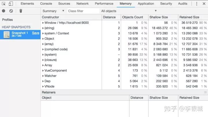 什么叫heap snapshot呢?翻译一下就是堆快照,给当前内存堆拍一张照片。因为动态申请的内存都是在堆里面的,而局部变量是在内存栈里面,是由操作系统分配管理的是不会内存泄露了。所以关心堆的情况就好了。