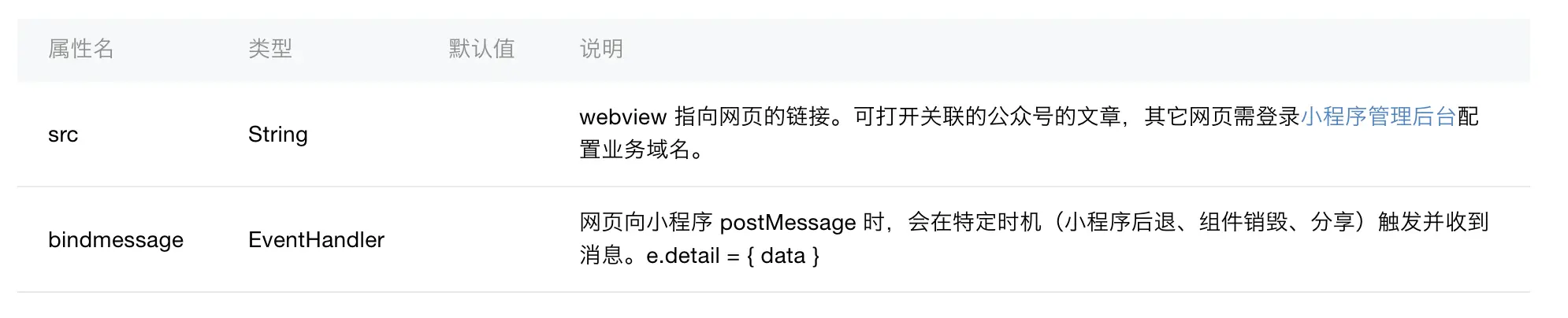 首先我们看看我们手头能用的API,JS向小程序发送消息只能通过postMessage,最坑爹的是小程序能接收到消息的时机只有三个场景(小程序后退、组件销毁、分享)。
