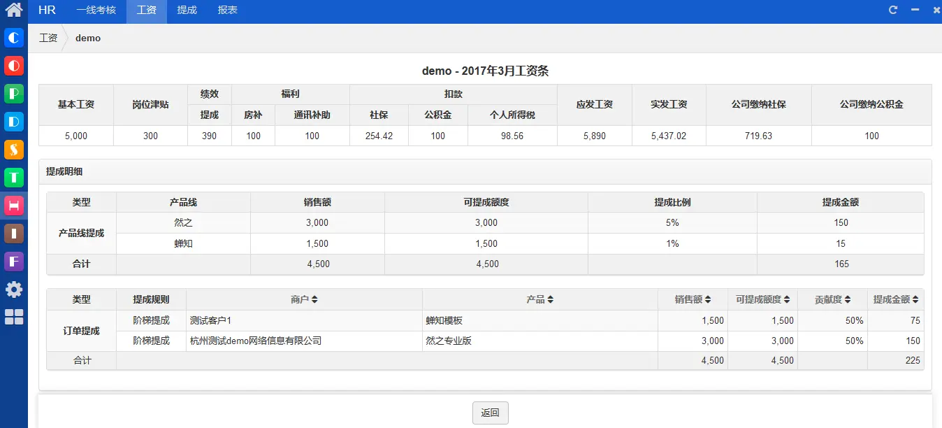 当然,由于员工的工资构成非常复杂,同样需要先设置规则(包含基本工资、绩效奖金、福利、抵税项、五险一金、提成规则等的设置),进而关联当月考勤,并生成工资条。员工在OA系统中可以查看相应的工资构成。