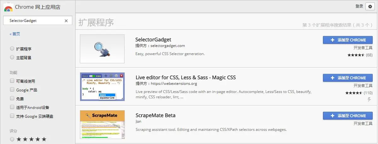 SelectorGadget 是一个Google的扩展程序,它的作用就是可以帮助你快速提取指定目标的xpath,并且操作十分方便,下面我来给大家展示一下如何使用。