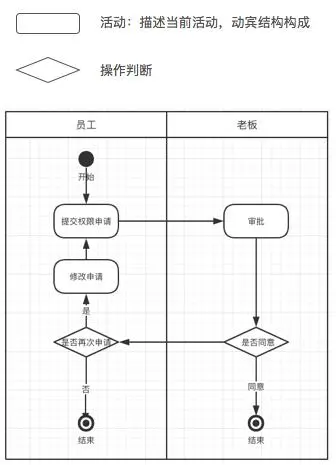 矩形框内描述当前活动,菱形块列出分叉路线。如果有多个角色,如下面的例子,则将每个角色出一个泳道,对应哪个角色的活动即放到哪个泳道下。