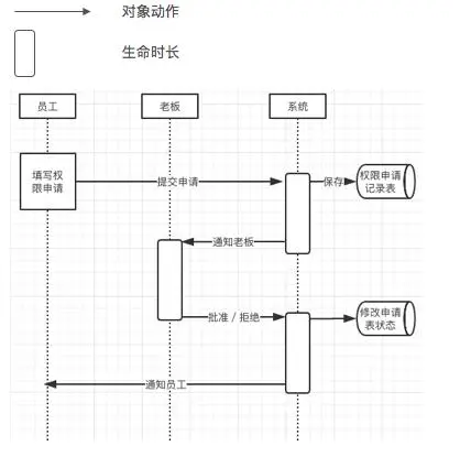下面我以员工提交权限审批这件事为例,对应地类(或者说是对象)有员工、老板、还是审批单,给大家主要介绍4个图。