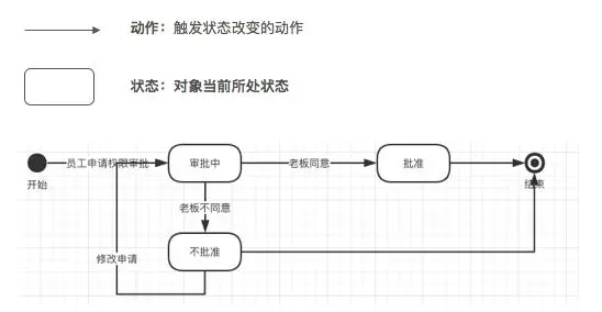 状态图的样式,虽说和活动图样式差不多,但其实内容差别还挺大的,状态图是对一个对象的不同状态切换进行描述。比如权限审批这个事情,审批单有“审批中”、“未批准”、“批准”这3种状态,通过这个图可以很清晰地了解各个状态的转换方式。