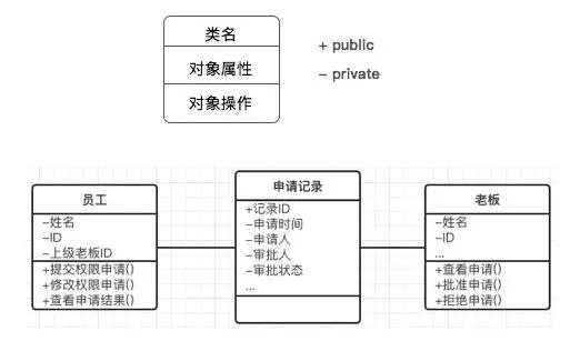 还是这个功能,我们有员工、审批单、老板这3个类,他们有些属性,对于员工和老板还有一些操作,可以通过这个类图来表述出来。其中有个+-号,+号是public,即其他类可见,-号是private,其他类不可见。比如员工的姓名,其他类无法获知,但可以通过一些对象操作获得。这个就有些偏开发的内容了,不是特殊需要开发同学知道信息,可以不对这块进行标注。