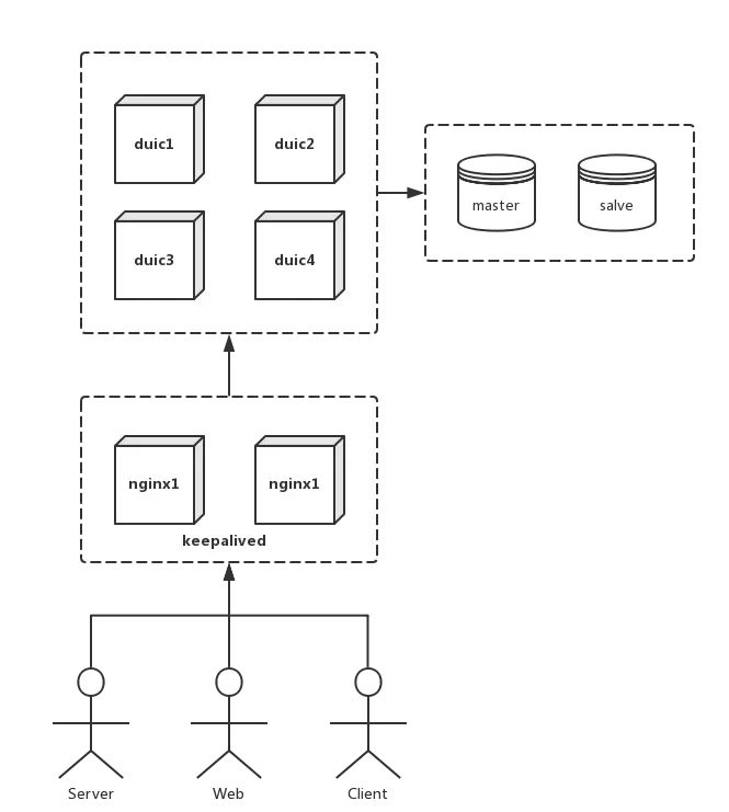 duic 对于数据库的压力非常的小,所以基本上数据库你只需要 master/salve 部署模式即可实现服务高可用。duic 服务你可以根据自身业务的压力情况部署 N 个。前面可以采用 nginx 做负载均衡利用 keepalived 避免单点问题。这是我们目前使用 duic 高可用的部署方案(仅供参考)。