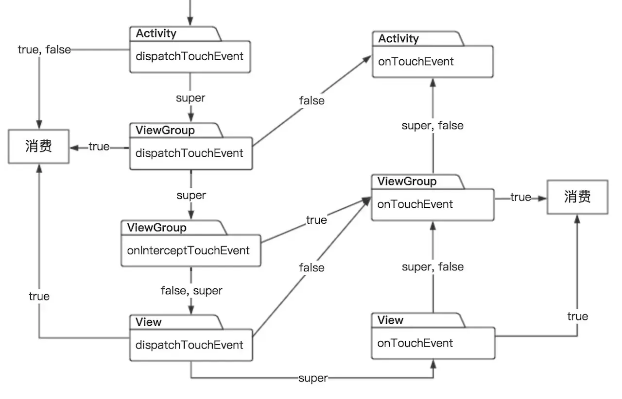 - ViewGroup 的 dispatchTouchEvent,用来向下分发事件。如果此方法内不调用super,直接返回 true 则代表直接消费终止。返回 false 代表不在分发直接交给复层处理。调用 super 则会执行 onInterceptTouchEvent 方法。
